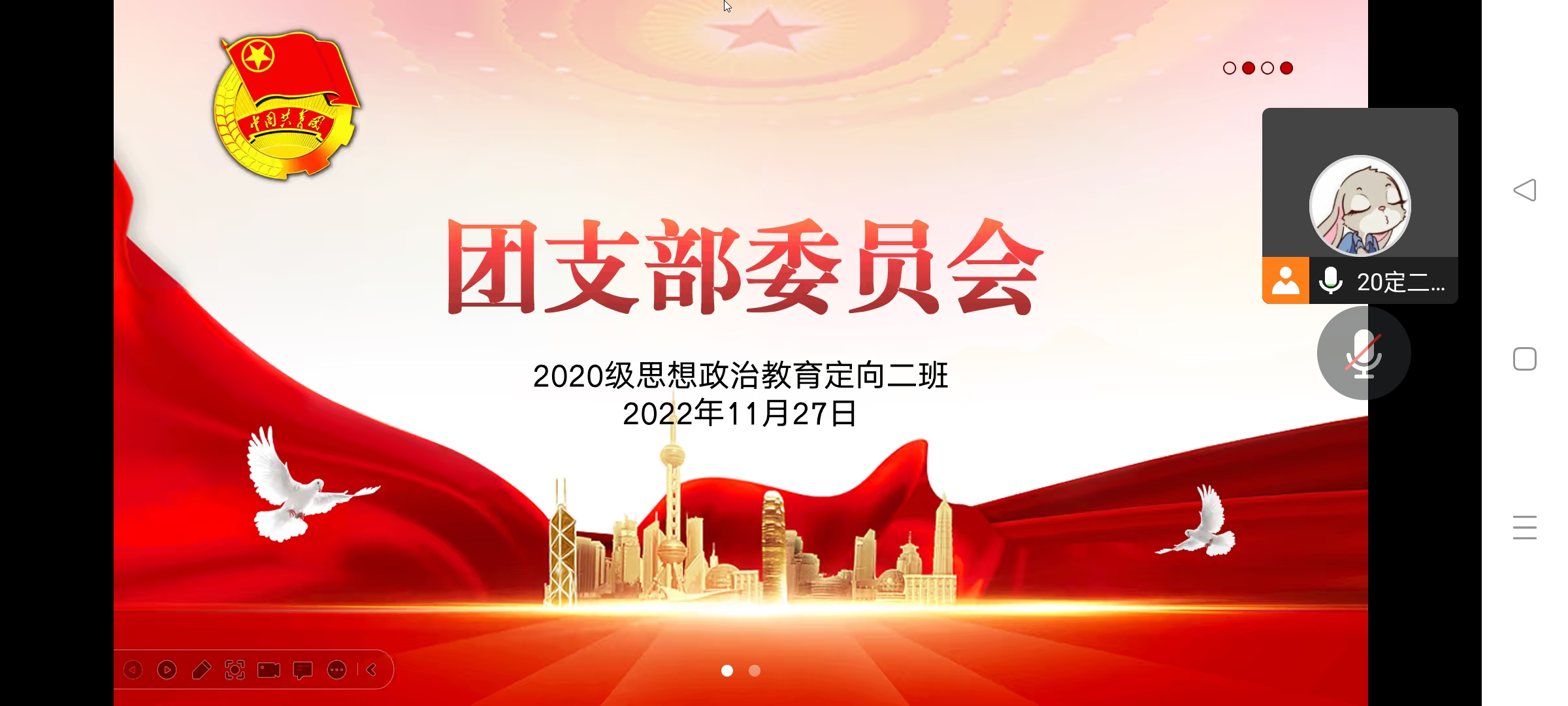 11月27日晚上,永利集团官网2020级思想政治教育定向二班通过腾讯会议召开班委工作线上述职会。定向二班全体班委准时参会。会议由团支书李晨曦主持。