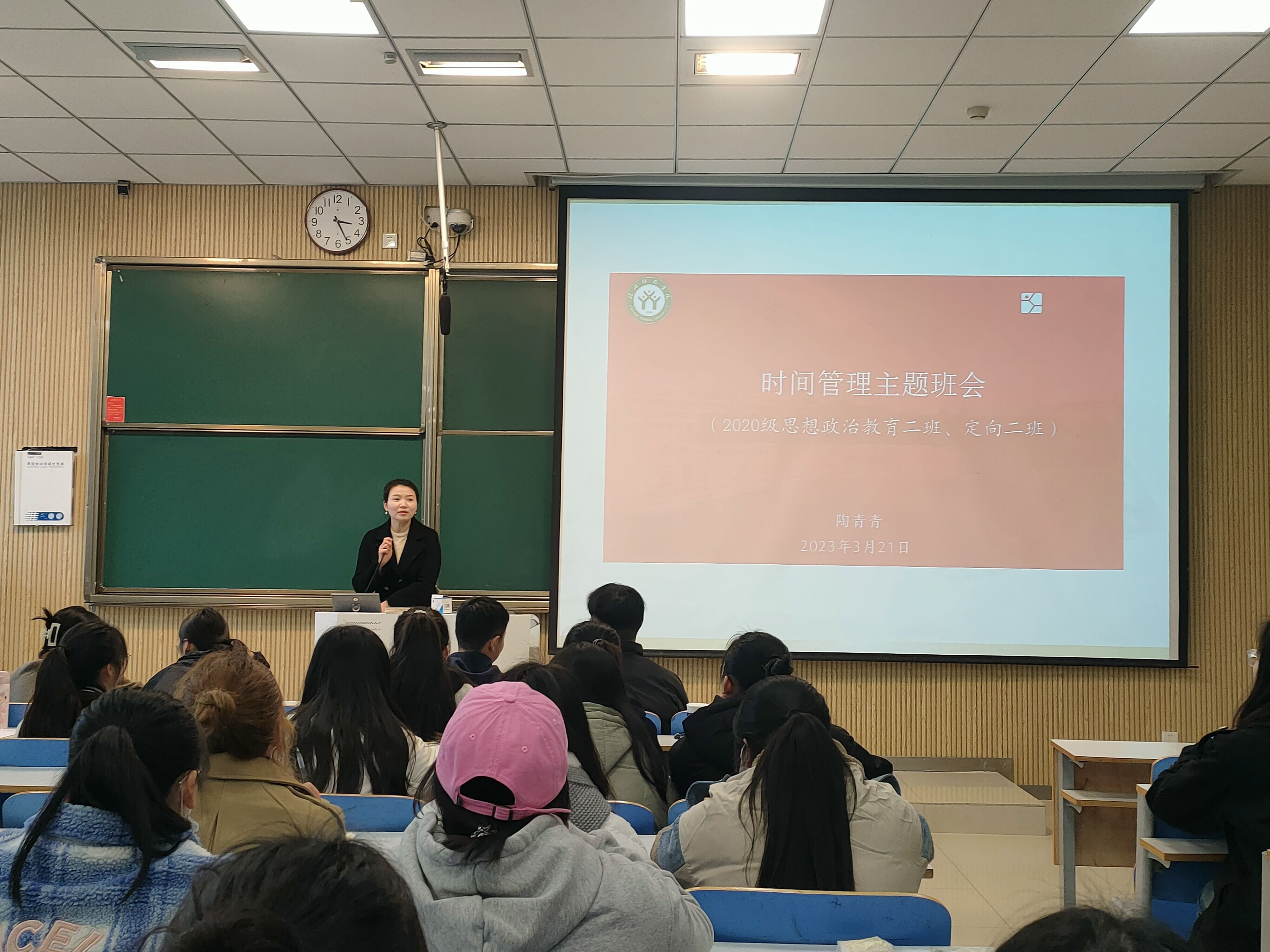 3月21日下午,永利集团官网2020级思想政治教育二班、定向二班在社科楼515教室召开时间管理主题班会。辅导员陶青青、二班、定向二班全体同学共同参会。班会由陶青青主持。