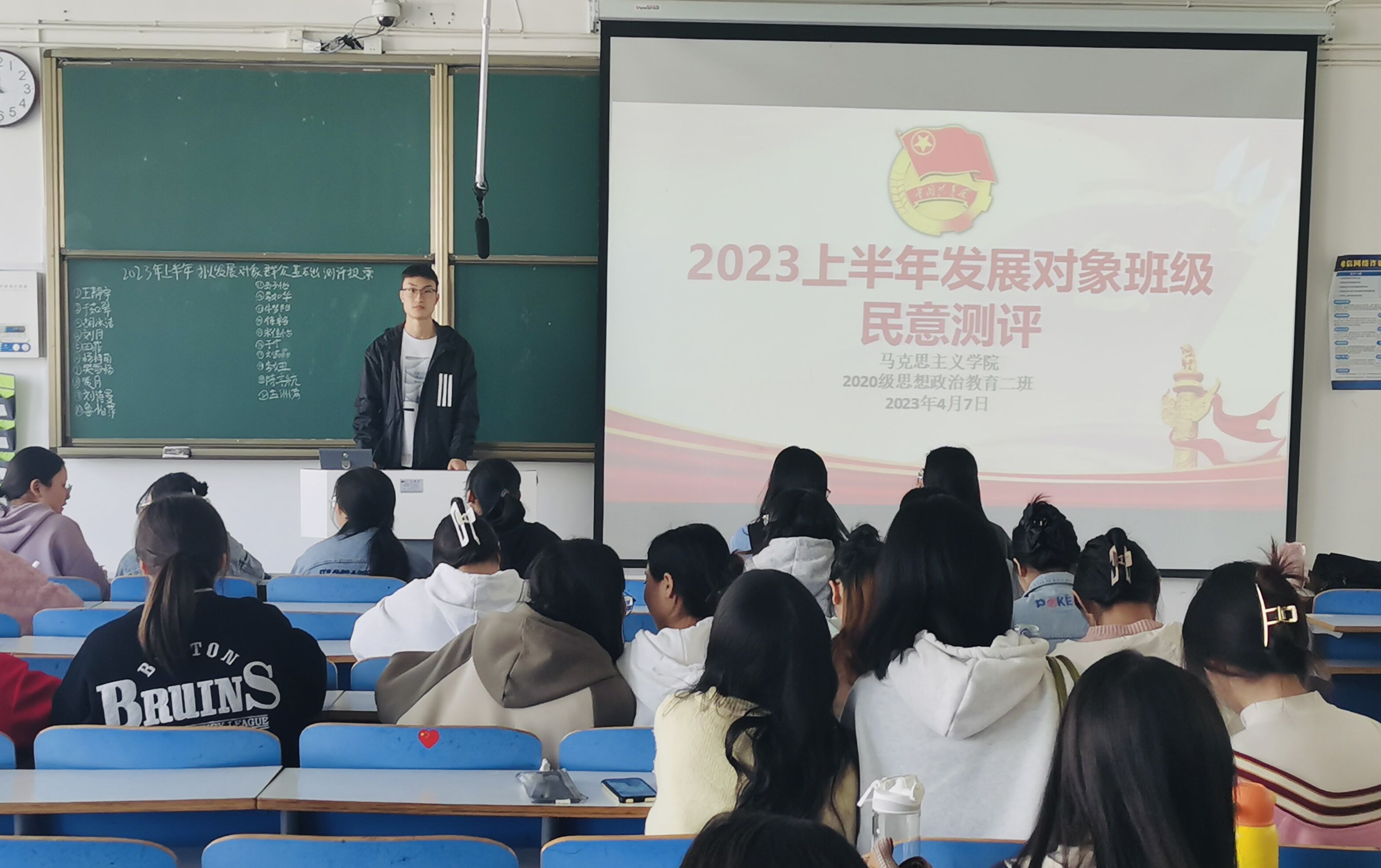 为进一步发展壮大党员队伍,为党支部注入新的活力,4月7日上午,永利集团官网2020级思想政治教育二班在社科楼517教室召开2023年上半年党员计划发展对象班级民意测评会。2020级思想政治教育二班全体团员共同参加本次会议。会议由团支书陈宇航主持。