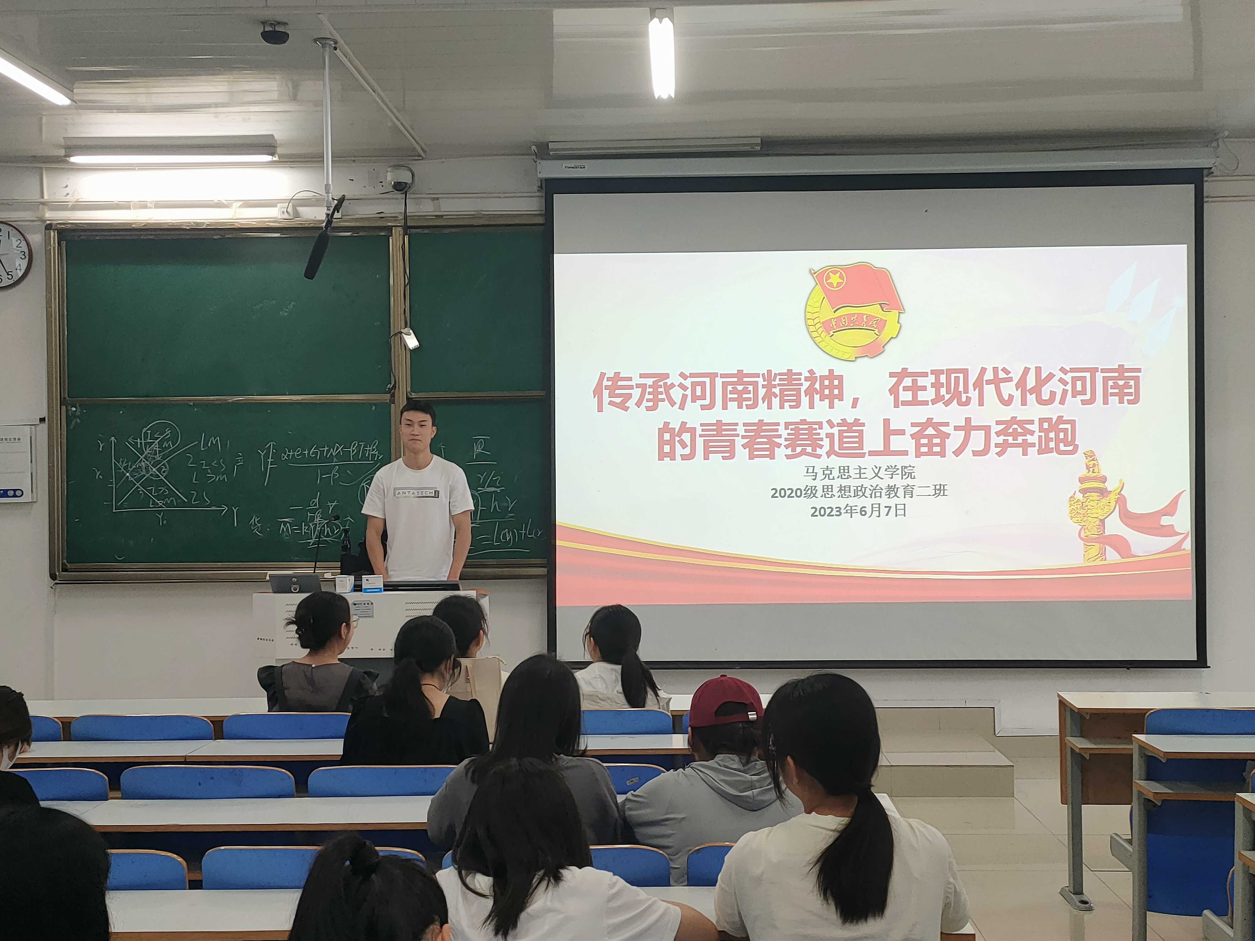 为重温河南省第十一次党代会精神,激发青年学生拼搏奋进内生动力,6月7日上午,永利集团官网2020级思想政治教育二班、定向二班在社科楼514教室开展“重温河南省第十一次党代会精神,凝聚现代化河南建设伟力”主题团课。二班、定向二班全体团员共同参与本次团课。团课由团支书陈宇航主持。