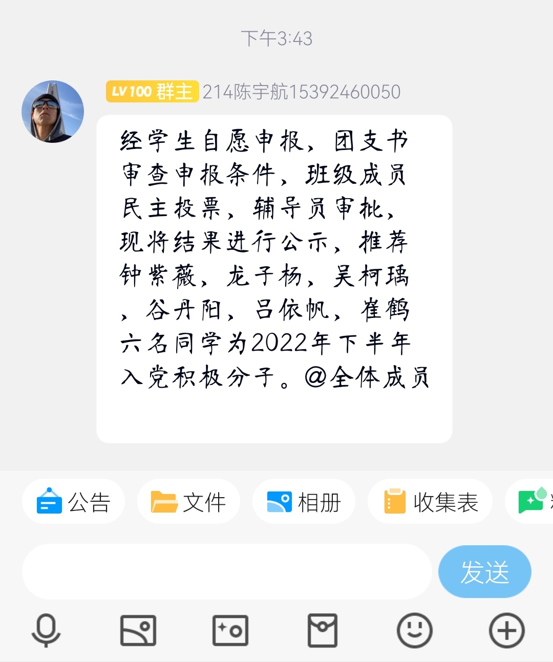 会议伊始,陈宇航宣读永利集团官网关于开展入党积极分子推优工作的通知要求,并对会议流程及投票表决规则作出说明。接着,我班入党积极分子候选人依次从学习、思想、工作等方面进行自述,为投票表决提供参考。随后,陈宇航在班级管理群内发起投票,我班团员严格遵照表决规则公平有序投票。最后,陈宇航将表决结果向全体团员公示,表决结果截图存档。本次推优会议在我班全体团员的全程参与和监督下顺利结束。