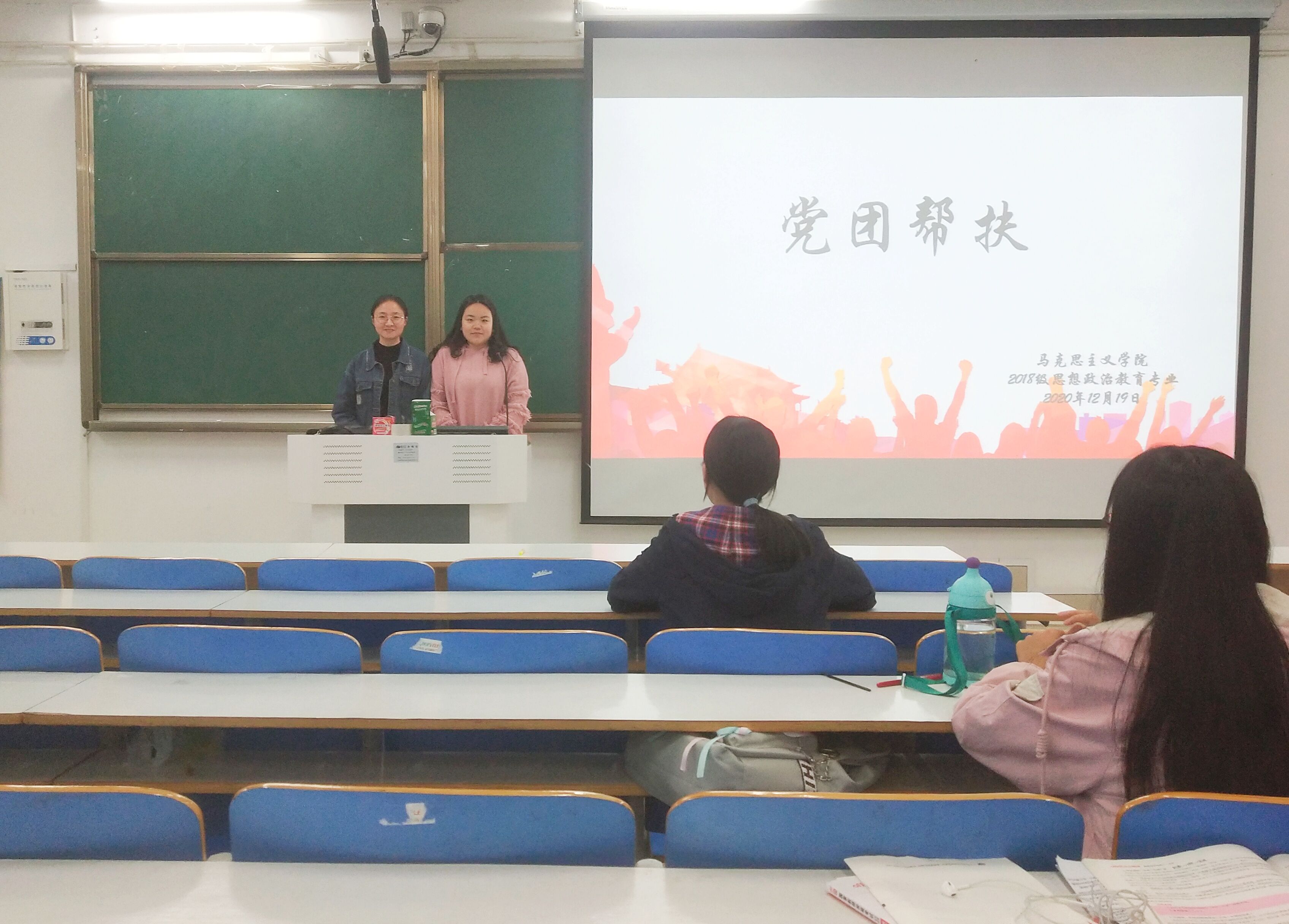 12月19日下午,永利集团官网2018级思想政治教育团支部在社科楼514教室顺利开展党团帮扶活动。永利集团官网2018级团支部邀请学生党员代表秦康怡、李梦茹前来参加此次交流活动。本次活动由2018级思想政治教育第二团支部书记黄子晋主持。
