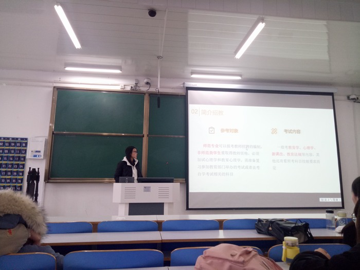 首先,张晓鑫向同学们介绍了招教的定义,简单讲述了招教的参考对象,考试内容以及参考流程,使同学们初步了解了招教是什么以及需要准备些什么。之后介绍了招教报考的步骤,分别是报名、笔试、面试、学校试讲以及才艺展示。报名通过网上或现场报名,等待审核材料。笔试按照1:4的比例考试,每科只录取考试人数的四分之一。面试一般是在教育中心或某个学校,随机抽取题目,靠个人的应变能力录取一半。学校试讲和才艺展示环节二选一,以及最后的体检,全部合格就通过。最后,张晓鑫通过表格清晰地展示了招教和特岗的区别,使同学们更好地选择自己喜欢的方向。