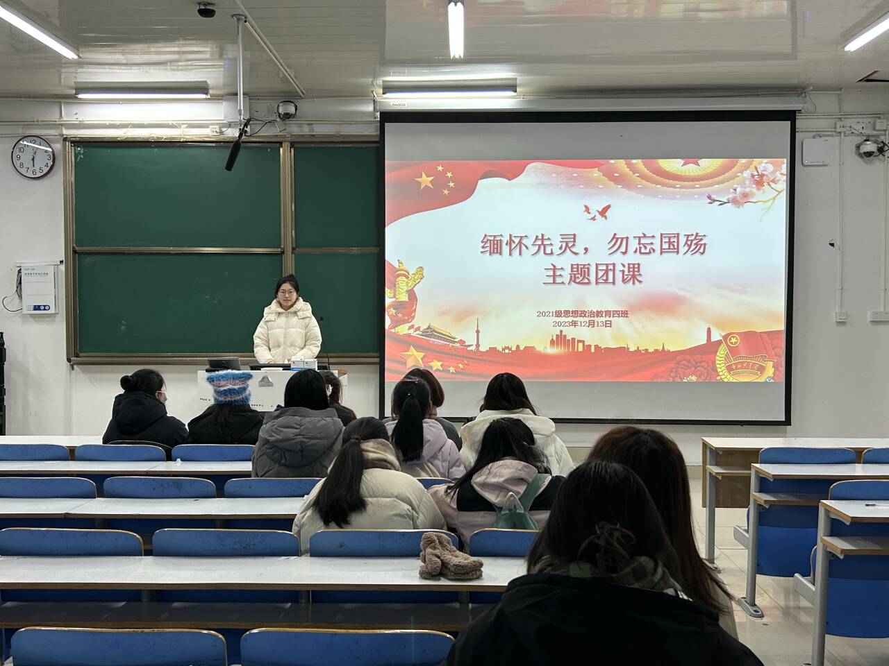 12月13日下午,永利集团官网2021级恩想政治教育四班在社科楼514教室开展“缅怀先灵,勿忘国殇”主题团课。2021级思想政治教育四班全体团员参加本次团课。团课由团支书刘珂含主持。