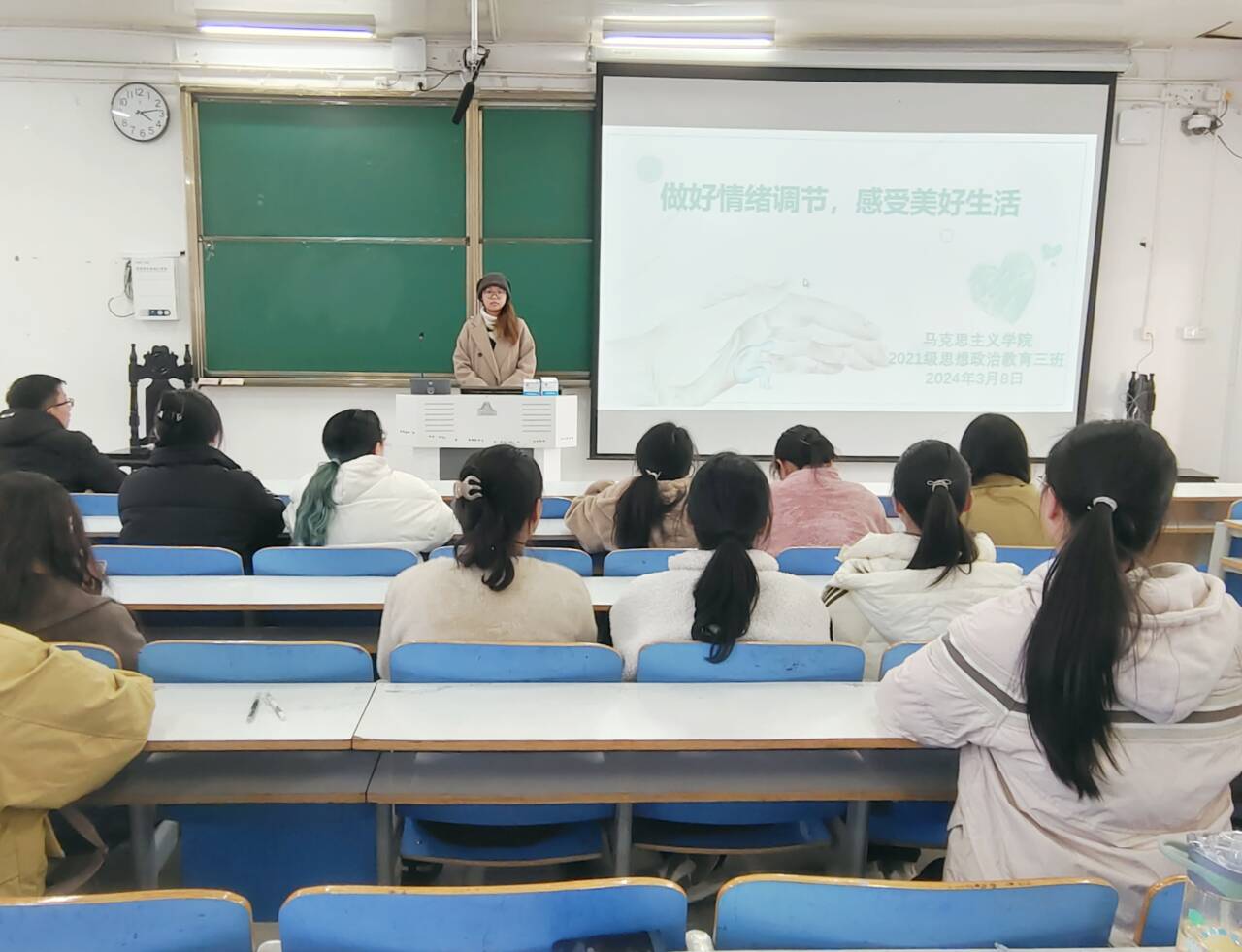 3月8日下午,永利集团官网2021级思想政治教育三班在社科楼514教室举办“做好情绪调节,感受美好生活”主题团课。2021级思想政治教育三班全体成员参加了此次会议。会议由心理委员许竞文主持。