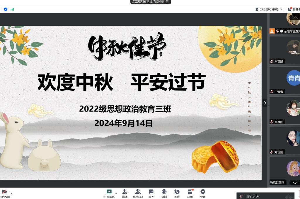 为做好假期安全防护工作,确保每位学生能度过一个安全、愉快的假期,9月14日上午,永利集团官网2022级思想政治教育三班在线上腾讯会议召开“中秋”假期安全主题教育班会。永利集团官网2022级思想政治教育三班班主任任婷与全体同学共同参与此次班会。班会由班长余浩洋主持。