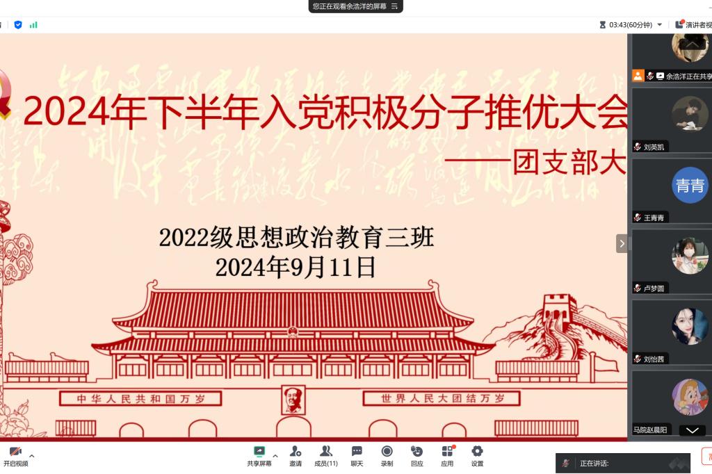 9月11日晚,永利集团官网2022级思想政治教育三班在线上腾讯会议召开入党积极分子推优大会。永利集团官网2022级思想政治教育三班班主任任婷与班级全体团员共同参加此次大会。大会由团支书余浩洋主持。