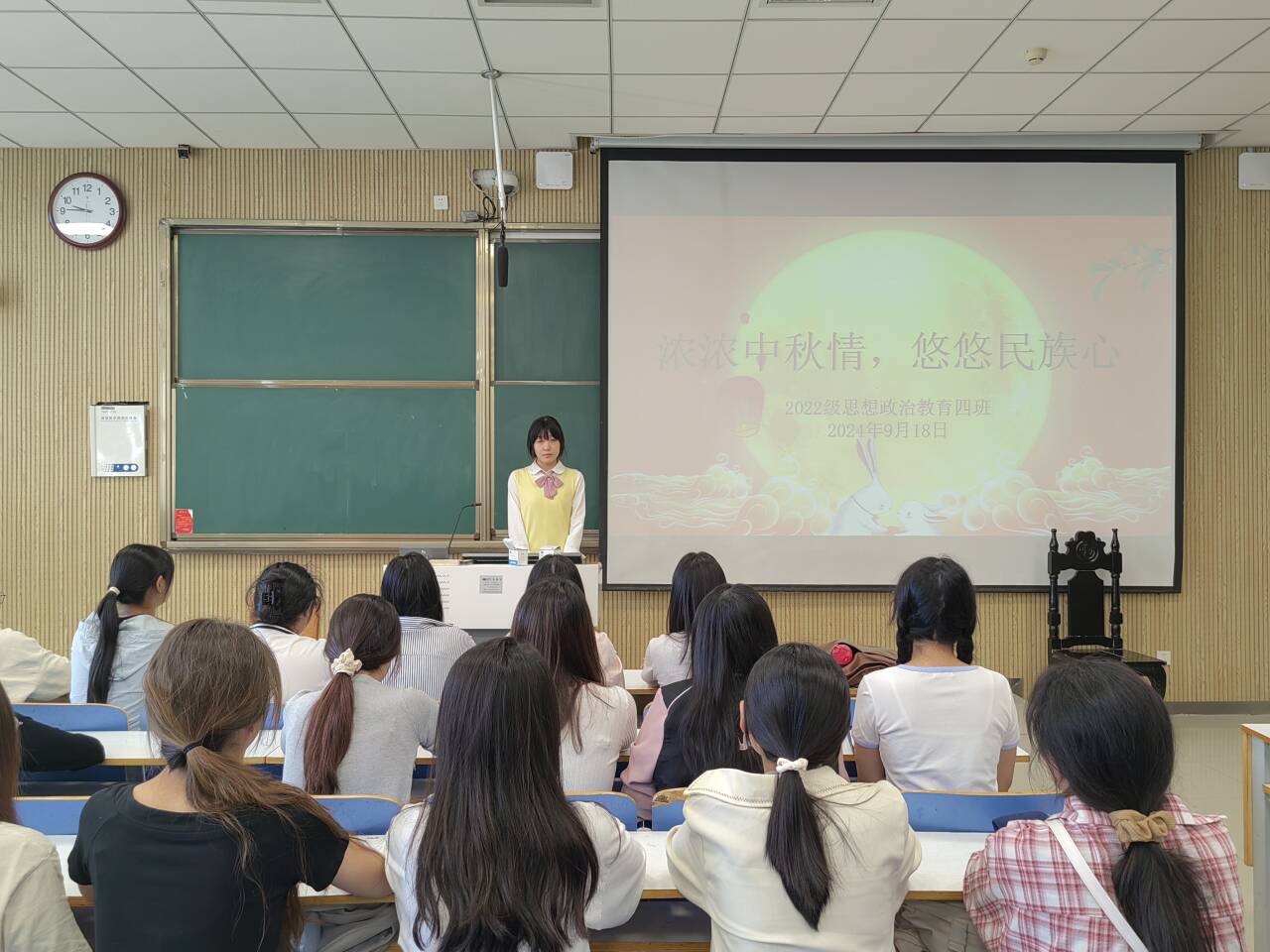 9月18日上午,永利集团官网2022级思想政治教育四班在社科楼515教室组织召开“浓浓中秋情,悠悠民族心”主题班会。永利集团官网2022级思想政治教育四班全体成员参与本次班会。本次班会由文艺委员周可盈主持。