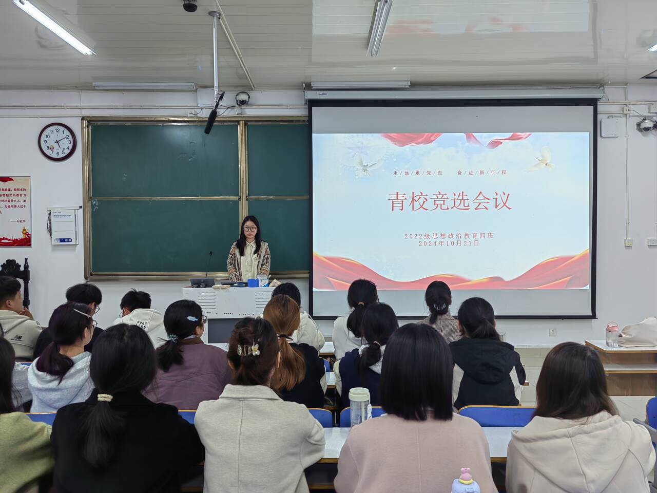 为认真贯彻落实习近平总书记关于青年工作的重要思想,加强对青年政治骨干的培养,10月21日下午,永利集团官网2022级思想政治教育四班在社科楼514教室组织召开“青校竞选会议”。永利集团官网2022级思想政治教育四班全体成员参与本次会议。本次会议由团支书牛志杰主持。
