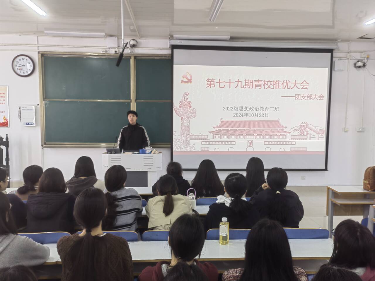 10月22日上午,永利集团官网2022级思想政治教育三班在514教室开展第七十九期青校推优大会。永利集团官网2022级思想政治教育三班全体团员共同参与此次推优大会。大会由团支书余浩洋主持。