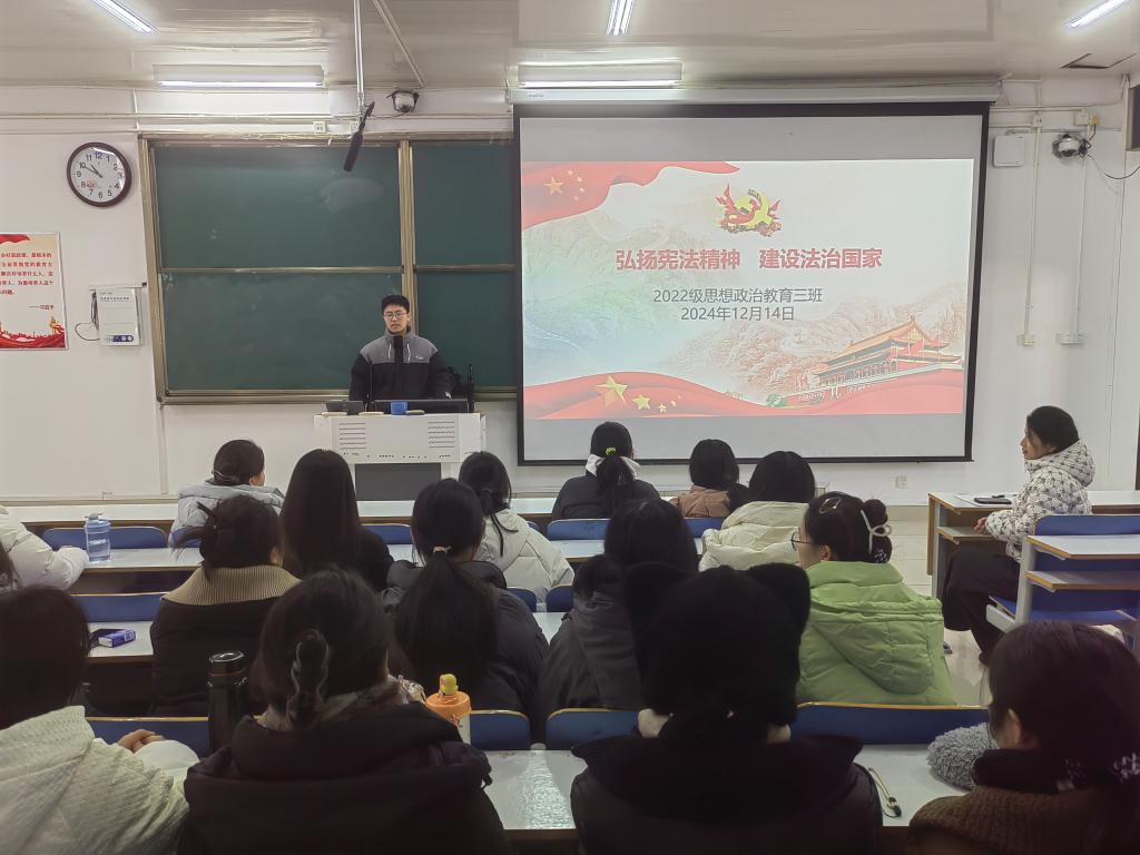 为进一步提高学生法治意识,12月14日上午,永利集团官网2022级思想政治教育三班在社科楼515教室召开“弘扬宪法精神,建设法治国家”主题团课。永利集团官网2022级思想政治教育三班学生共同参加本次团课。团课由团支书余浩洋主持