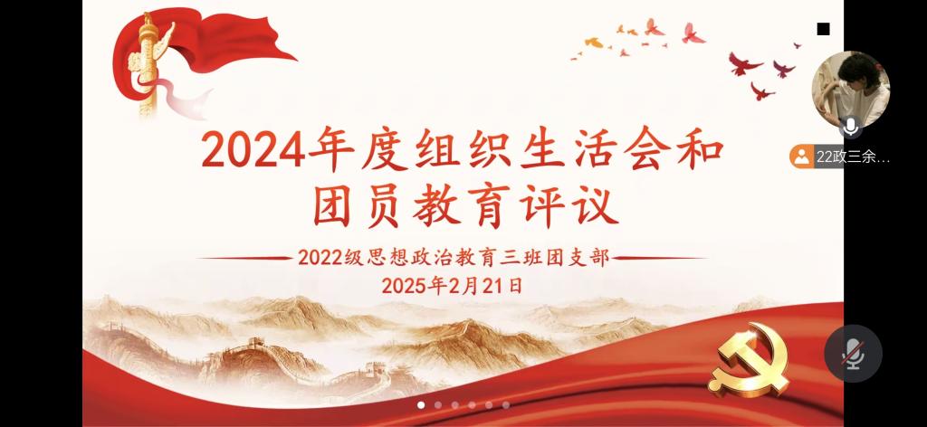 2月21日上午,永利集团官网2022级思想政治教育三班团支部利用腾讯会议召开2024年度组织生活会暨团员教育评议会。永利集团官网2022级思想政治教育三班全体团员共同参与。会议由团支书余浩洋主持。