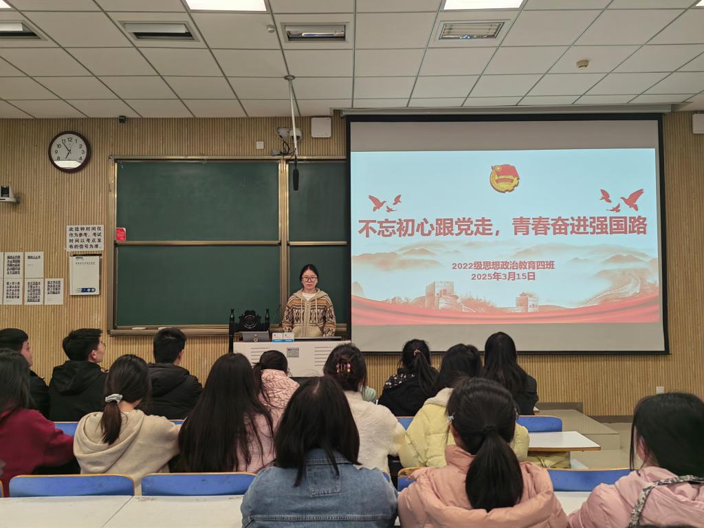 为深入贯彻习近平总书记关于青年工作的重要思想,引导团员青年深刻感悟“两个确立”的决定性意义,3月15日上午,永利集团官网2022级思想政治教育四班在社科楼515教室组织召开“不忘初心跟党走,青春奋进强国路”主题班会。永利集团官网2022级思想政治教育四班全体成员参与本次班会。本次班会由班长牛志杰主持。