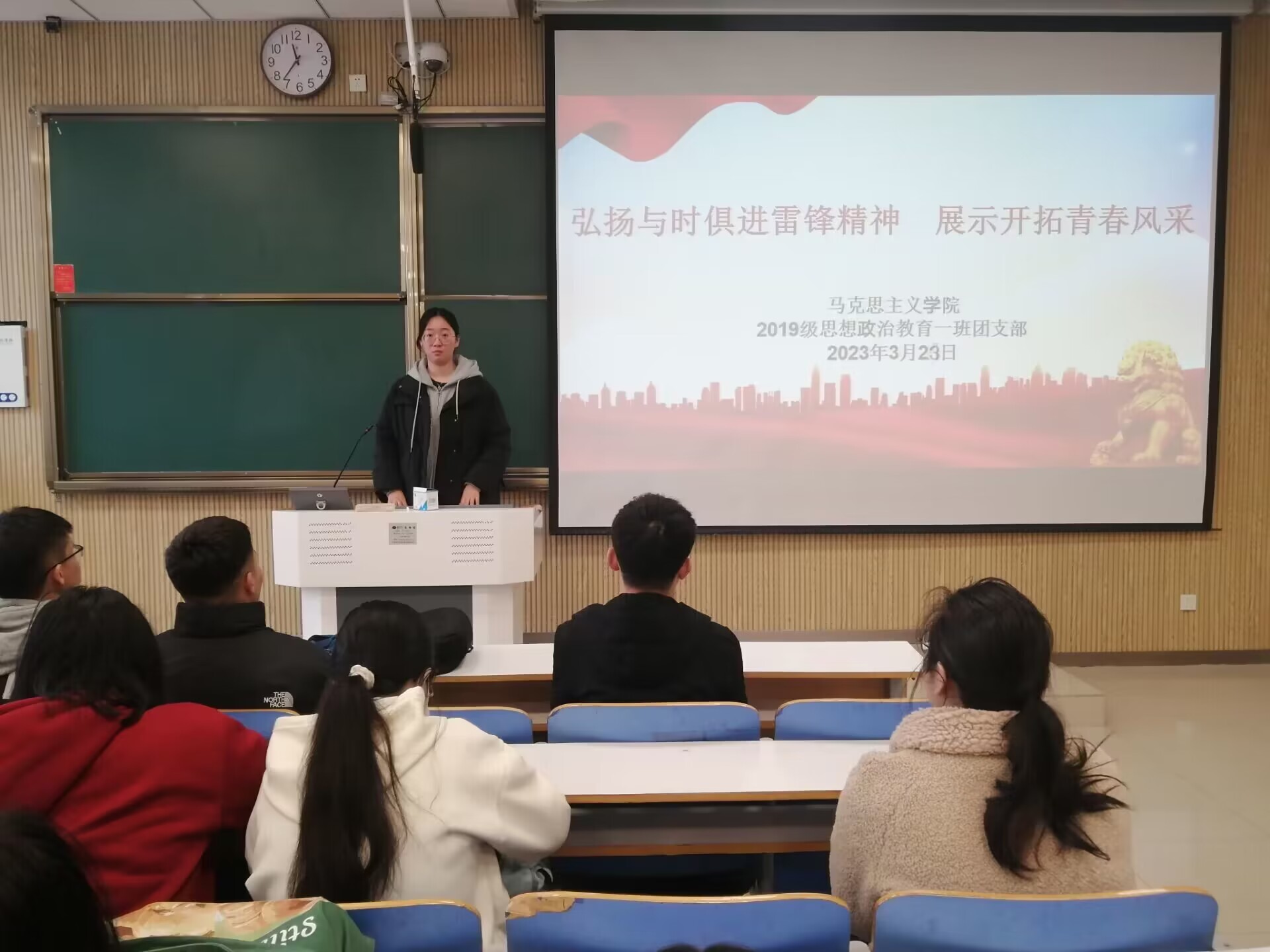 会议伊始,贾子漪向团员们强调了学习雷锋精神的重要性。接着,她通过播放视频的方式带领团员们回顾雷锋同志的一生。紧接着,她邀请雷诗雨、王一帆、王梦雅等同学上台逐一分享有关于雷锋同志的事迹、故事以及发生在身边的好人好人。最后,副班长王民带领团员们齐唱歌曲《学习雷锋好榜样》。