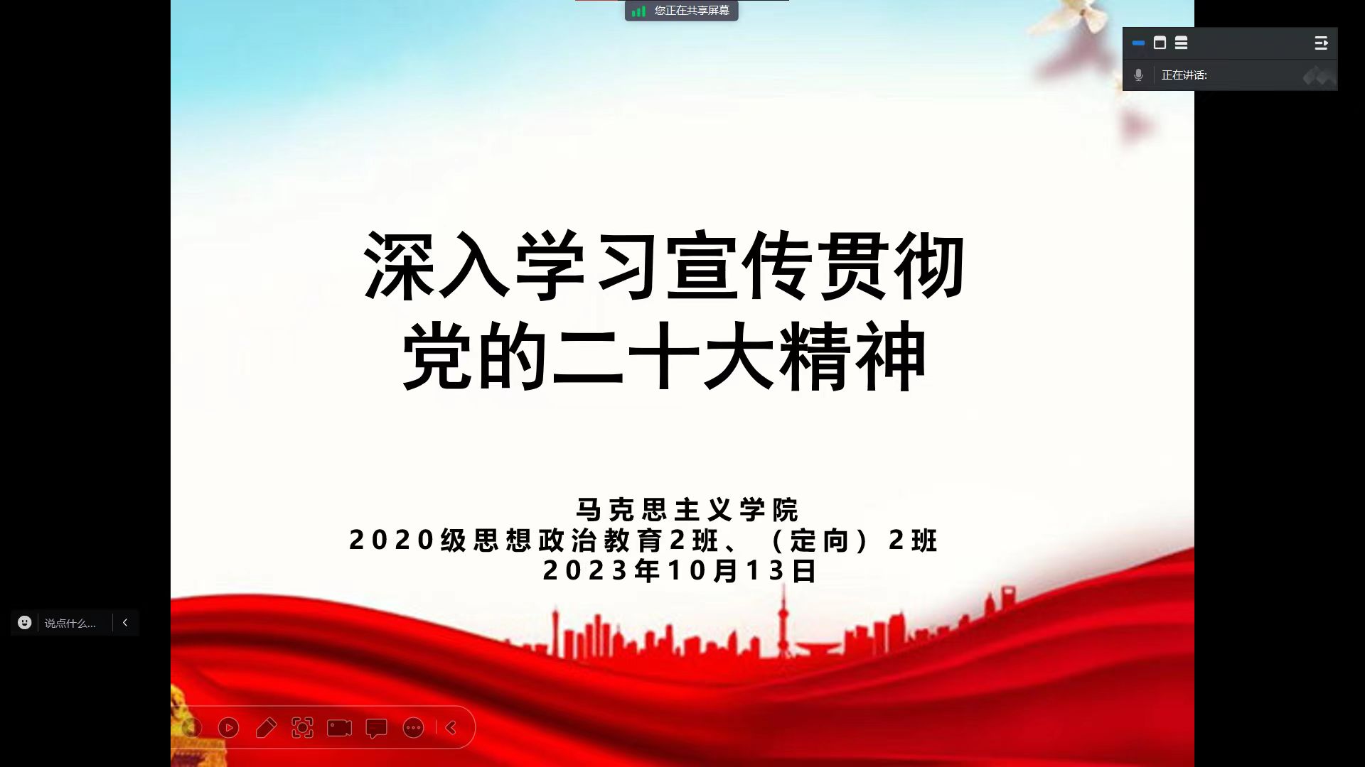 为推动主题教育进一步走深走实,10月13日下午,永利集团官网2020级思想政治教育二班、定向二班团支部通过腾讯会议开展深入学习宣传贯彻党的二十大精神主题团课。二班、定向二班团支部全体团员共同参会。团课由李晨曦、陈宇航讲授。