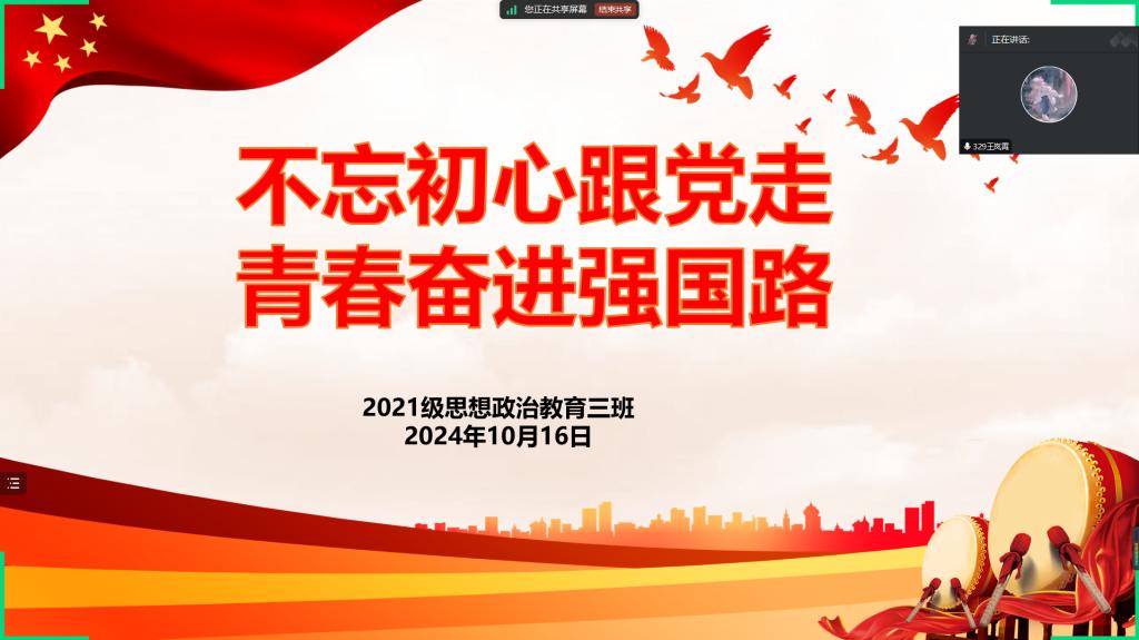 10月16日上午,永利集团官网2021级思想政治教育三班在线上召开“不忘初心跟党走,青春奋进强国路”主题团课。永利集团官网2021级思想政治教育三班全体团员参与此次团课。团课由团支书王岚霄主持。