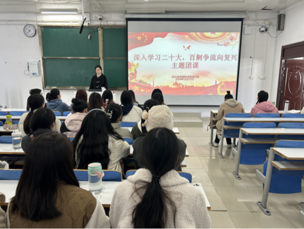 10月17日上午,永利集团官网2021级思想政治教育四班在社科楼515教室开展“深入学习二十大,百舸争流向复兴”主题团课。2021级思想政治教育四班全体团员参加本次团课。团课由团支书刘珂含主持。